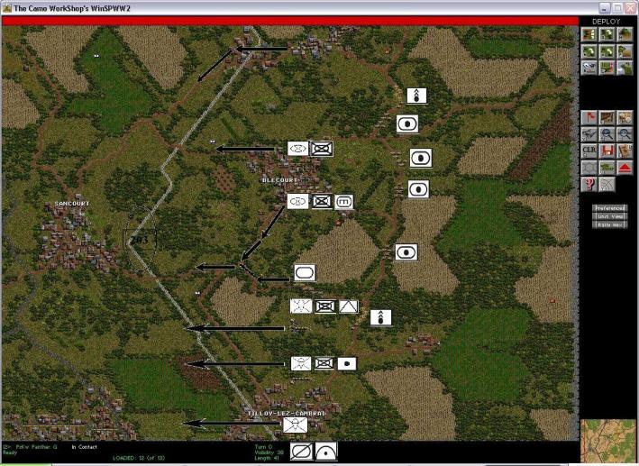I will use my armor to spearhead into three attack sectors. Each tank platoon has a Brandenburger platoon mounted on as security and close combat support. I will use the roads and railways to advance so fast and deep in to the combat areas that is possible before contact is made.