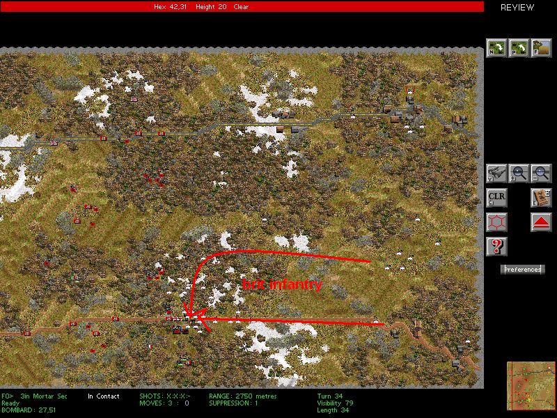 In the north things get hotter as my sniper repulses some infantry moving along the road. so i can hit them with my mortars. then he retreats