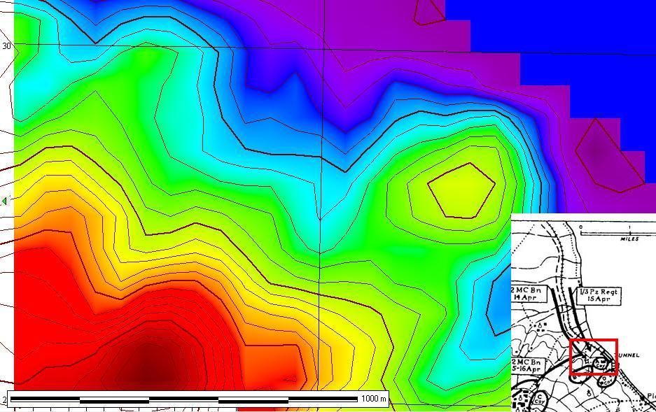 This MICRODEM map defines an area of 1,8 Km x 1,2 Km, which gives a 36 x 24 hexes WinSPMBT map.