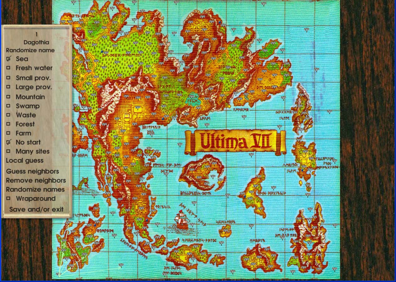 I made a map using the Ultima 7 Black Gate map, 289 provinces... came out pretty good I think. Added special locations for magic sites (Dungeons, shrines, Bucaneer's Den, etc.) and added moongates to make for an interesting play.