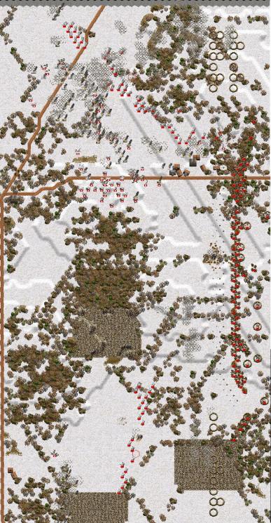 I've attached a screen print of the entire front as it stands now. Unfortunately, it is kind of small in the thumbnail view, but might be larger if downloaded. Toward the bottom, my south flank column can be seen heading north. More to the north a mass of enemy tanks can be seen on the eastern hill just south of the road. North of the road can be seen the carnage my tanks have inflicted on the enemy thus far. I've pried them off the north edge and have their flank in the air.