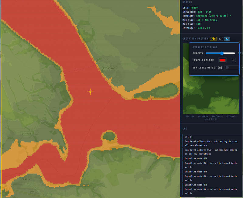 Mousing over the Volga river reveals that it's height is 84~ metres. We enter that into the Sea Level Offset input box; and turn on the Coastline 🌊 mode.