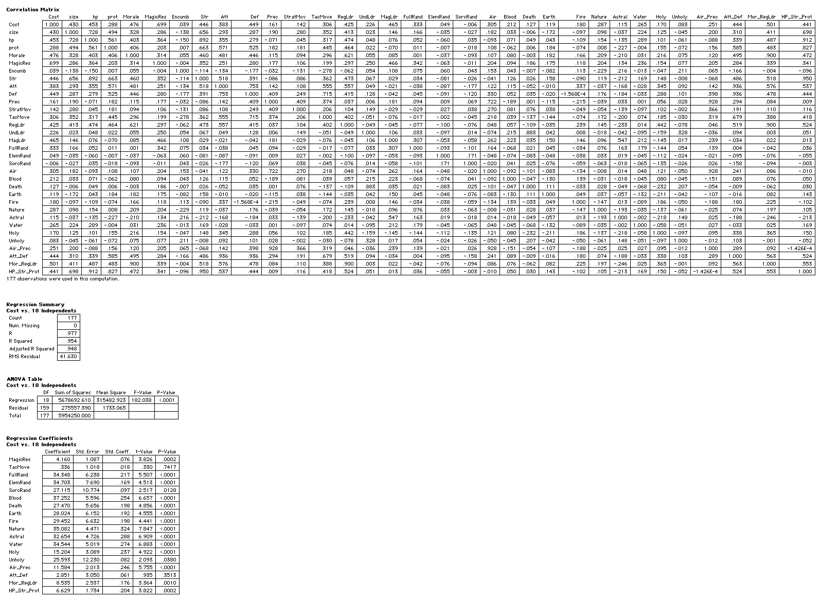 Thats why I reccomend doing a similar study of the summonables. With their higher skill levels, natural protection, hp, etc. they would show a clearer picture of what these very desiravle characteristics cost. ALSO, we know the approximate gold value of 3 types of gems (death, fire, and earth). Sushi is skilled enough to make non-linear guesses, as is likely important to describe the costs of some units like the iron dragon and tarasque. He probably does not have the time to do everything at once though.