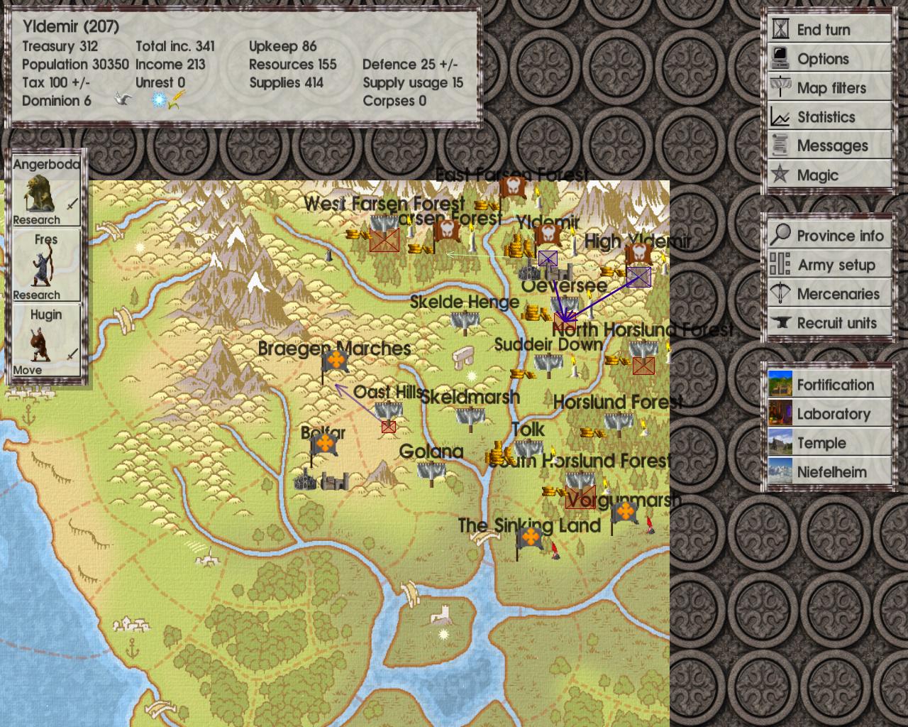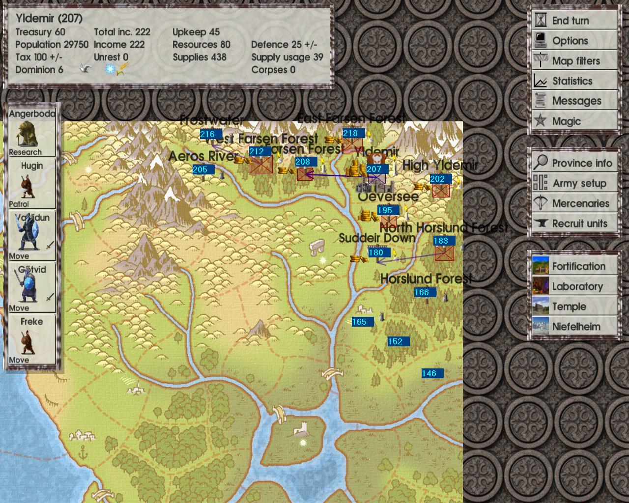 I send Hugin back to my capitol to pick up the 6 Jotun Spearmen that will be there next turn. I send Freke to (202) to pick up the 2 Jotuns that fled there. Vaklidun and Gotvid will search (195) for magic sites while they await reinforcements.
