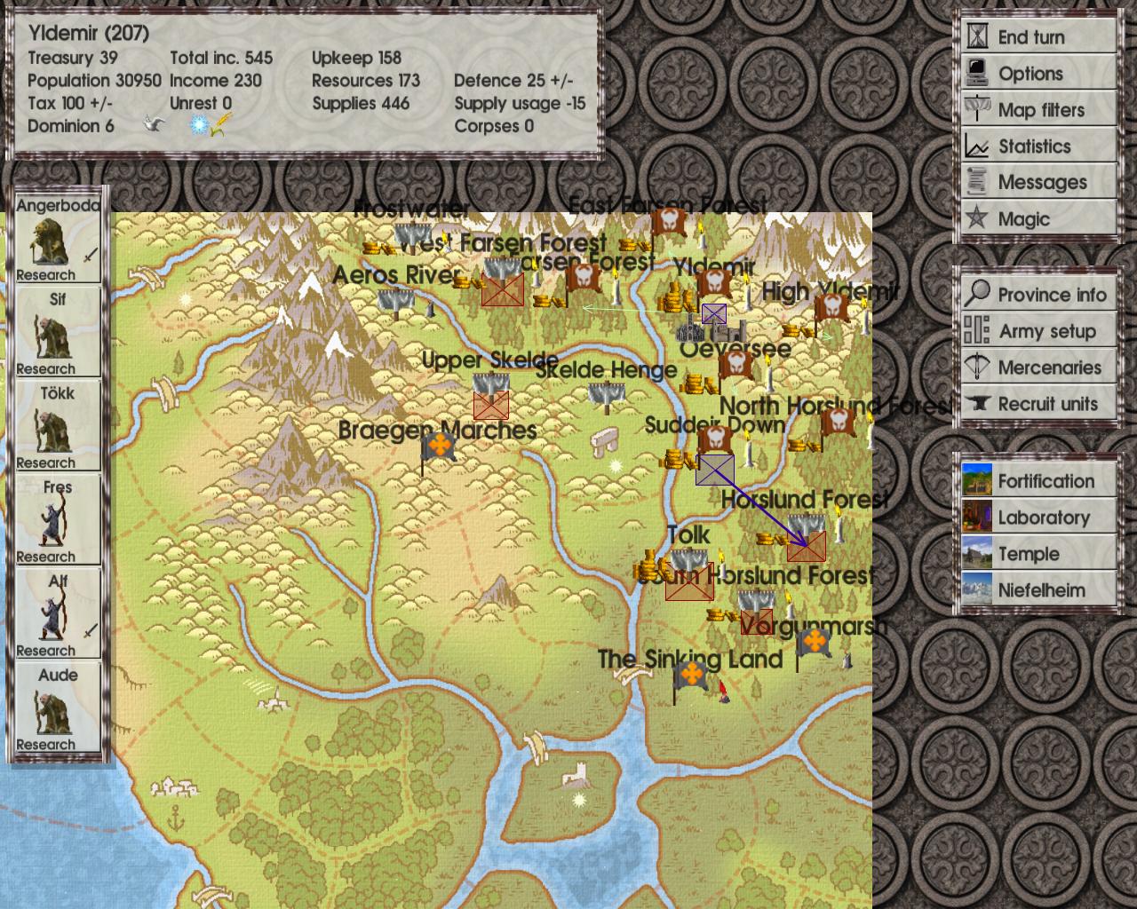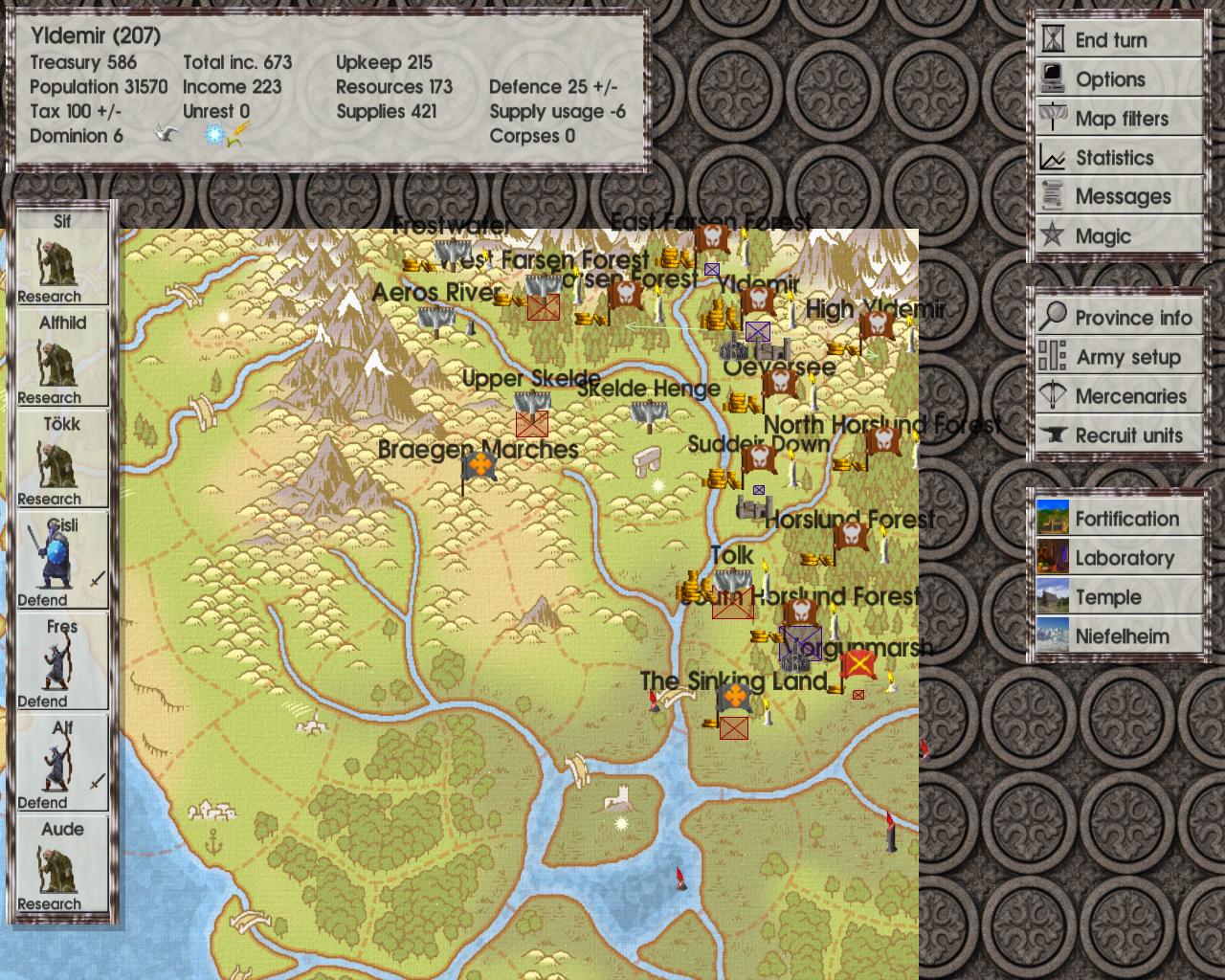 Hugin starts to construct a castle in (152). I have Freke and Vaklidun search for magic sites in (152) while they wait for the ring to be forged. Gotvid has already searched this province, so does some research this month. I consider having Vaklidun forge some winged shoes, but decide to wait.