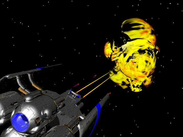 Ah well, Aaron has said that SE5 will be able to handle 2D ship pics, they just won't look quite as pretty. Well, here's the new Terran Frigate, yup the same one that got us through the Earth-Venduu War. Course, unless you were a frequenter of the Galaxy of Fire BBS about 8-odd years ago, you've got no idea what I'm talking about. Which is cool, I'm used to it.