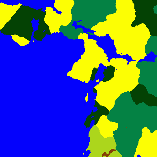 forests (green), farmlands (light green), swamps (dark green), mountains (brown), and water (blue). There should be some wastelands in there, but the algorithm is not quite complete.