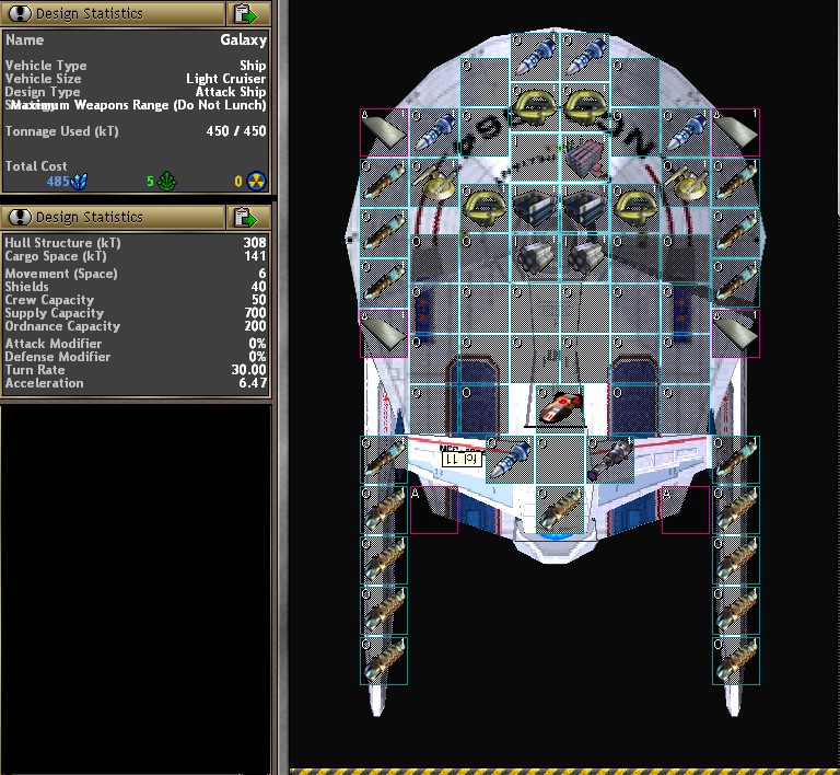 2404.6 – This month the Senate approves Chairman Whitmore’s request for 4 more Quasar Class FGs and accompanying small craft. The Senate also earmarks funds for the upgrading of all Agamemnon Class DD to the Agamemnon II Class; the only difference being the new version mounts 6 XO Standard Missile racks. The Senates generosity does not end there though. Since two more Wyoming Space Yards have come on line this month (bringing the total to four) the Senate agrees to fund the production of 2 new Galaxy Class LC [Light Cruiser]. This ship, which will be the largest warship the Republic has ever undertaken, was designed by Sukhoi Aero-Space Industries. The Galaxy Class (attached) utilizes 9 Military Engines to accelerate it to 6km/s. Offensive capability is provided by 5 Missile Launchers, 1 Laser, and 8 XO Standard Missiles. Defense is in the form of 2 Basic Point Defense cannons, 4 Shield generators, and 40kT of armor wrapped around the outer hull. Construction time for 1 Galaxy Class LC is 5 months. One of these new flagships of the Republic is earmarked for Admiral Derek who was just promoted and charged with command of the newly formed Republican Guard. Six Agamemnon II Class DDs are also earmarked for this fleet.