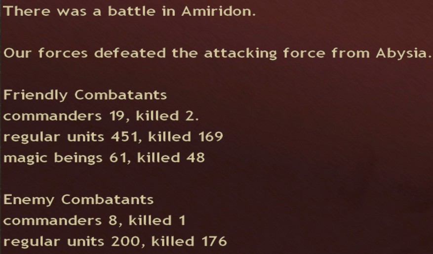 Ok, so with those hints, I expect (not with great confidence) then that there was a big central melee where the Abyssians probably killed or ignited (via heat aura) enough of Man's fodder that Man routed after not doing much injury to Abyssia's heavy infantry, but they were too slow to chase down whoever routed on Man's side.