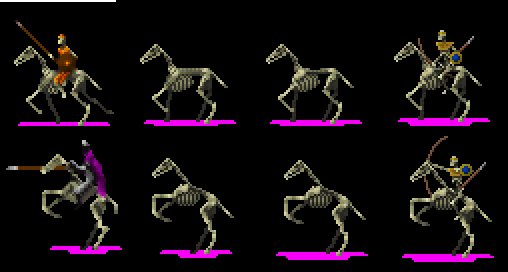 The top row is the normal sprite, the bottom is the attack sprite. On each row the first picture is the source pic, the next two are progressively altered versions, and the last one is the final Tomb Kings version with a rider.