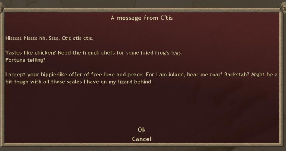 Sauromatia also got this message, and we've tasked the useless old crap we get instead of a scout to decode it. The only word he's been able to find so far is "Ry'leh" which he thinks might mean R'lyeh. Perhaps its a warning about this mysterious people.