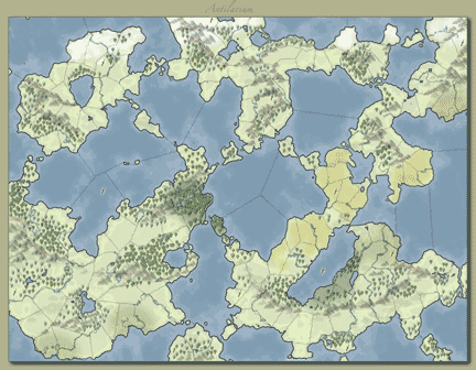 #description "217 provinces, including 32 water. Starting locations are established for 12 nations, 3 of which are underwater. Nearly all water provinces are contiguous, and can reach all parts of the map. Landmasses are separated, mountainous, with many interconnections. Magic is plentiful. Game victory is acheived by controlling 8 of the 16 special victory sites. Two of the 16 sites are underwater, and count double toward victory. Each victory site is marked on the map by an embedded sword.