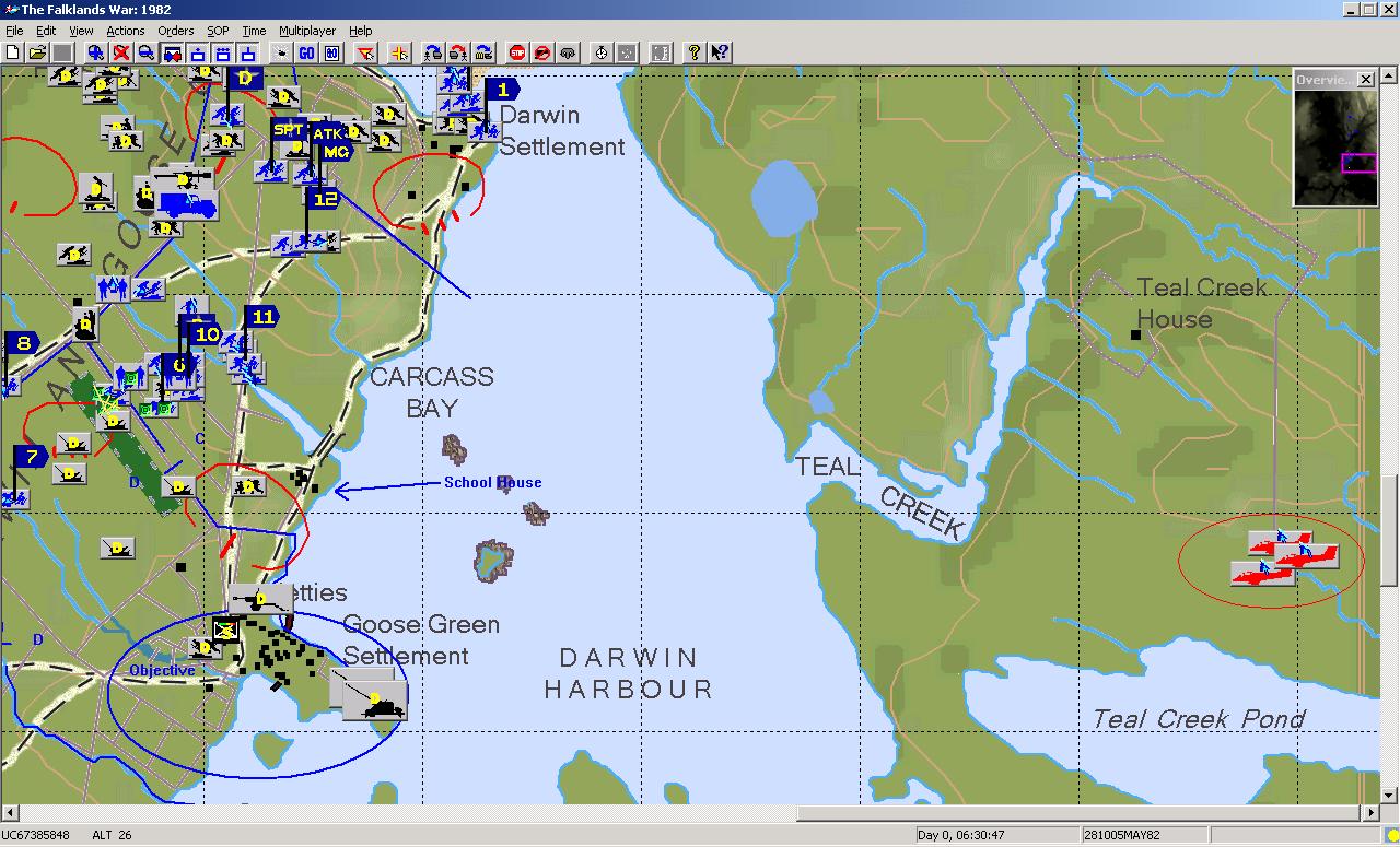 The pucaras in Goose Green are in flight and therefore are almost impossible for arty to suppress or destroy. You will need to use your blowpipe gunners to good effect.