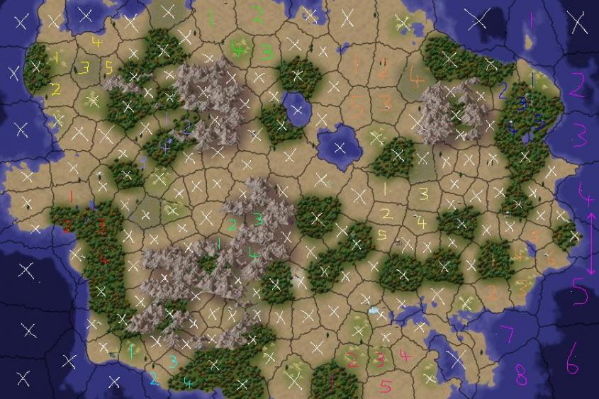 The map never got used in the end (as a map with more water was needed) so no idea if this 'zone' start idea works in practice. The test games I ran though always had nations starting in separate zones as planned (and not two accidentally in the same 'zone'), but not sure how effective it was at stopping the 'beeline to nearest capital' tactic for rushers. Think it helps a bit, but certainly not as much as pure random starts would.