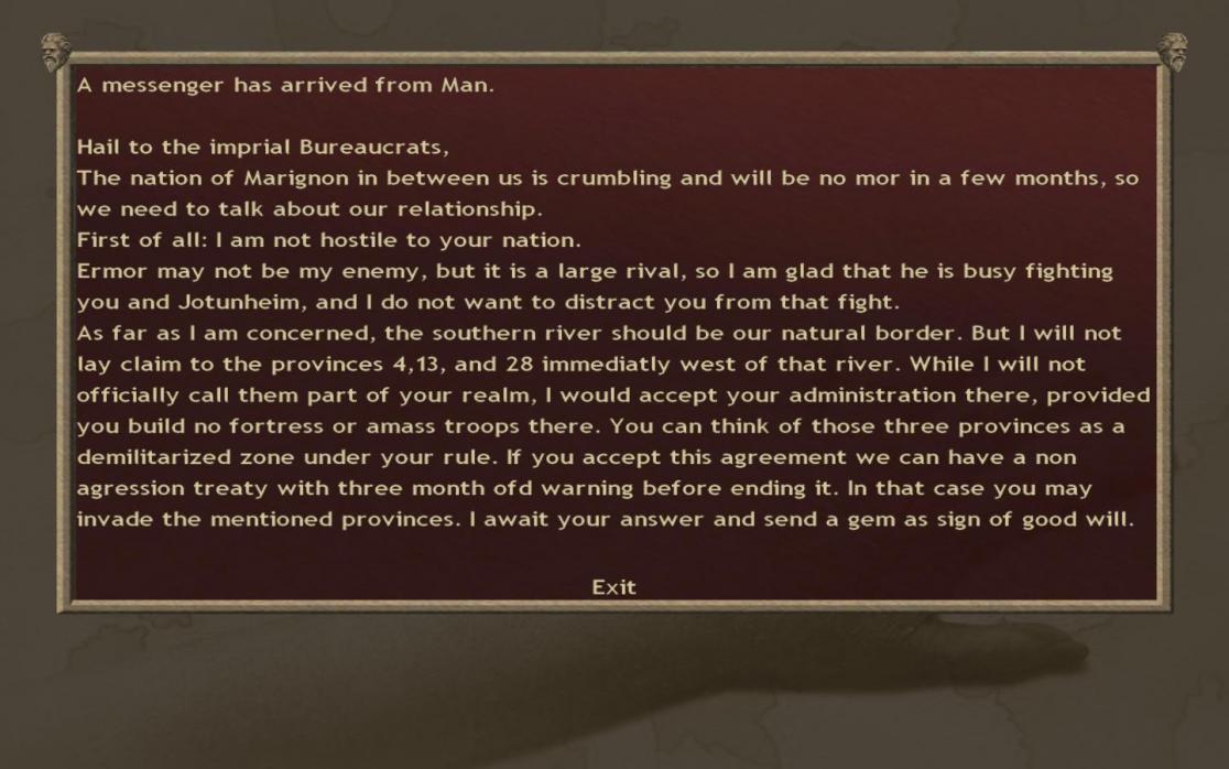All Jotunheim and T'ien Ch'i told Us was we are not ALLOWED to take provinces because they fought a war in the east. We could have taken the south of the island from Ermor a year ago, without anybody able to stop us. And now they FORBID it. And even Our generous offer is just put aside as if a child squibbles while the grown ups decide. Thats not the way the nation of Man expects to be treated.