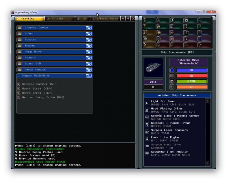 3. Not clear if the "Message Repeater" effect does anything more than spam the log with double messages (including player prompts like "Press [SHIFT] to change crafting screens").
