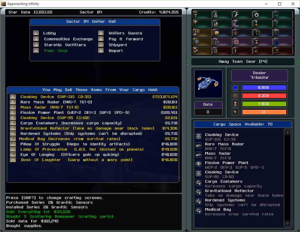 (Sector 84, Normal, Cloaking device SUP:315 CD:35 has a sale price of $723,871,104)