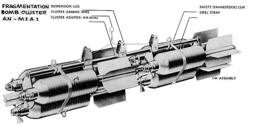 The bomb is normally clustered into the M1A1 cluster of six bombs (fig. 5). The following loads, prescribed in USSTAF Ordnance Memorandum No. 3-54, 16 March 1944, were carried by aircraft in use by the U.S. Air Forces: