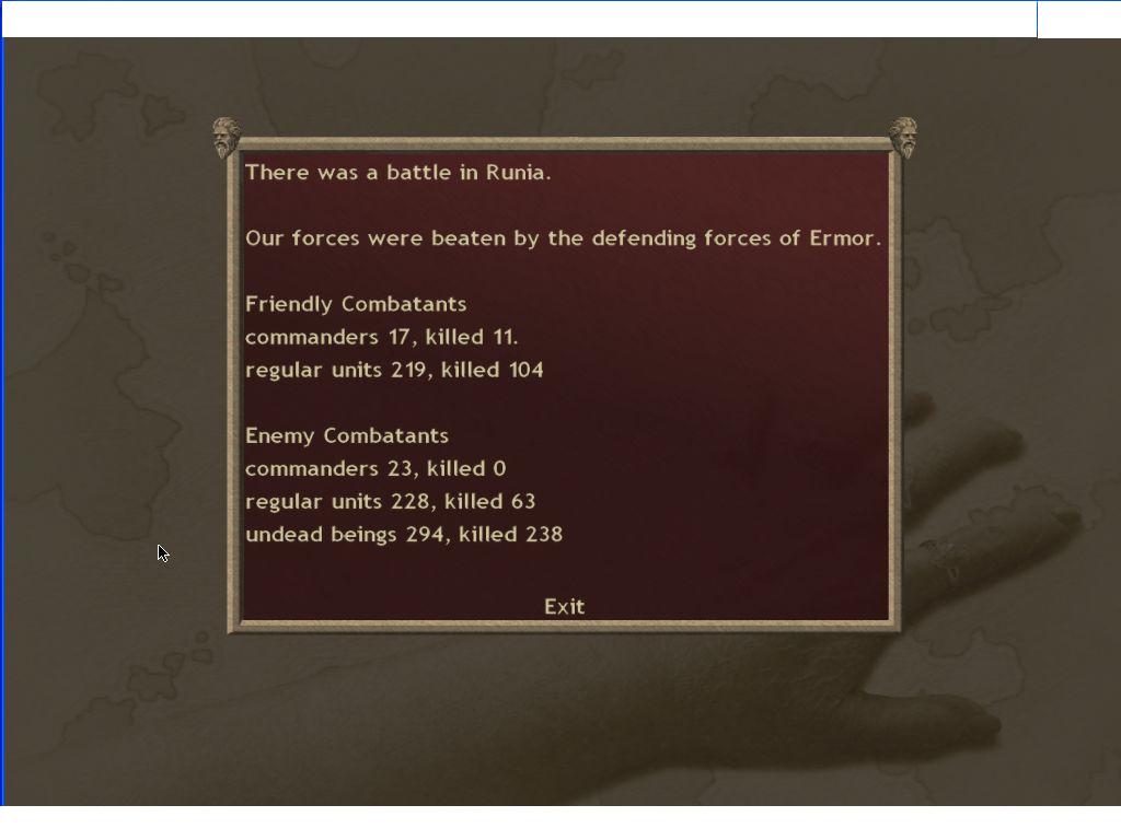 It's rather remarkable that among all the carnage you inflicted, you did not kill a single Ermor commander! Was this just an aberration? Or was there a reason for this? In a long battle where both sides take a beating, you'd normally expect an errant arrow or spell to do in at least one commander.