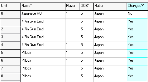 2/ Is most likely the reason Andy gave for the difference. The name "4.7" is not used in any Japanese OOB I have but I only have back to 2004 and they are named 120mm which is what 4.7 is so either the name was 4.7 when the scenario was built twenty years ago or the unit was modified to not have armour and the name was changed at the same time so that one I will leave as is. The "tell" for that is shown in Scenhack which shows a YES under Changed? which indicates that unit had been changed along with a few pillboxes so that means it WAS the scenario designer who changed it