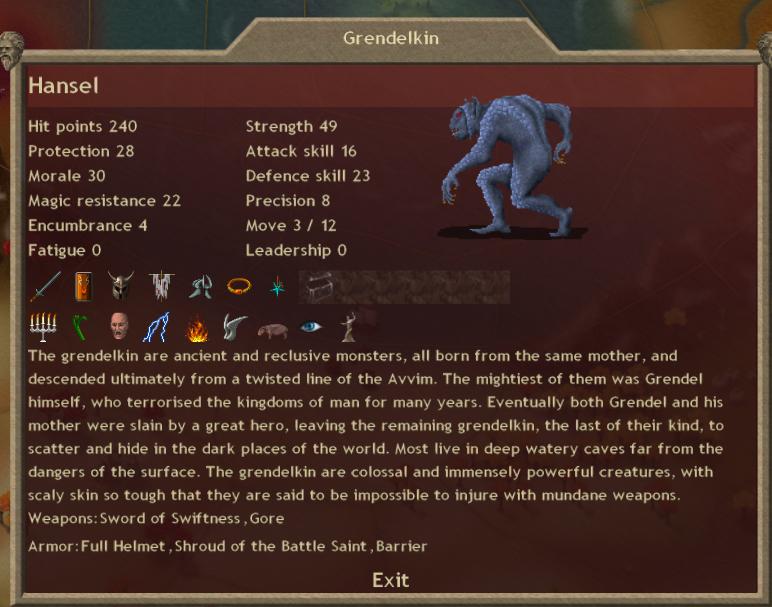 Just for fun, I've got a grendelkin picture. Hardly ideal gear, really... this one exists to kill armies of 100+ warhammer ogres. As you can probably tell, it hasn't quite gotten that far yet. My ideal anti-sc would have quickness, probably dual swords of swiftness or anti-undead weaponry, and an insane attack skill. That's an e9n4 shroud it's wearing by the way, and it has 36 regen a turn. If you have anything resembling a decent bless, a shroud makes a lot of sense to slap onto one of those. Imagine one with W9/Fx/Nx