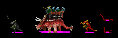 Well I've added Stegadons. Currently they use a placeholder graphic which is little more than a resized, adjusted and slightly cleaned picture of the miniature with a skink howdah dropped on top. But amazingly it actually looks quite good. I'll just paint over it when I do the proper graphic - it makes a great base. No attack sprite though. I don't want to get bogged down by the stegadon graphic because I'm easing myself into graphics with the sacred summon stuff and the slann - it will have to wait for another update. Anyway I thought I'd show you what it looks like currently - it's the biggest unit width-ways in the entire game afaik.