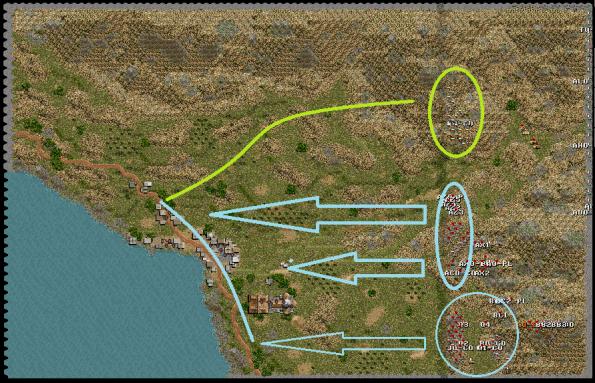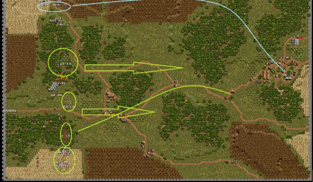 Meanwhile the Gebirgsjaeger with the help of the tanks platoon are moving along the northern flank trying to sneak around the flank.