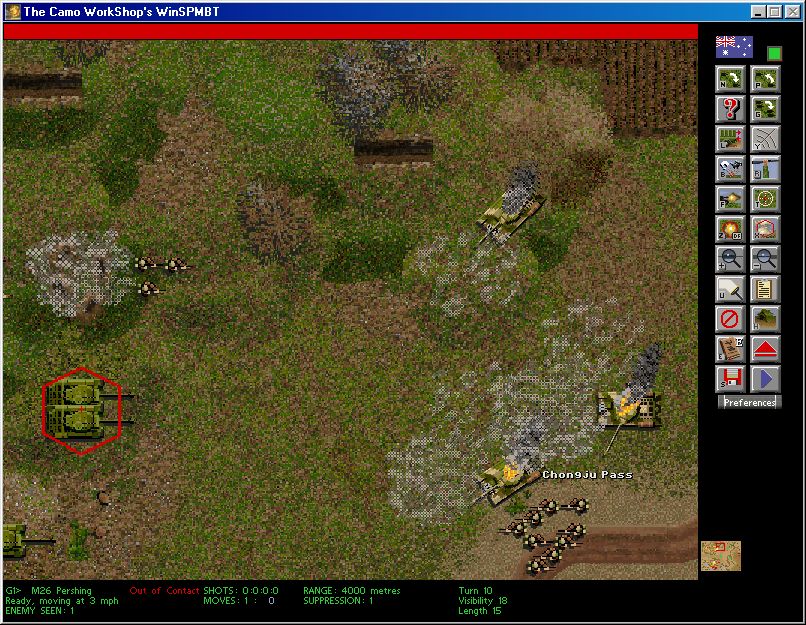The four remaining pershings swing down into the pass and advance on the victory hexes.
