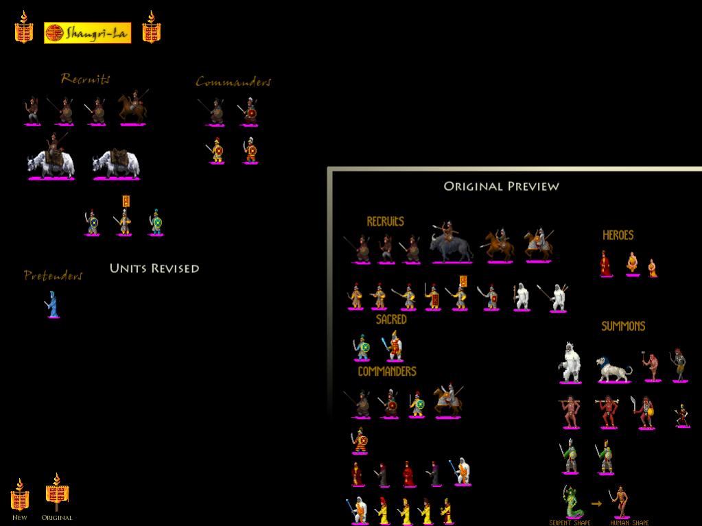 • Sprites tweaked: Shangrilan heavy infantry, archers and crossbowmen. Overhauled Shangrilan heavy cavalry (Rta Pa and Rta Dmag Go), Ascended One (hero) and Ascended Master (pretender).