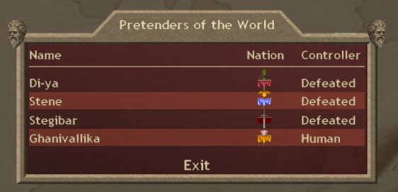 I thought about air, but I figured I could archer decoy with those Bandar, which mostly worked pretty well, but it would have been easier to just have air shield from bless. If I could get a water9 + fire9 blessing that would be pretty impressive, but difficult to do, especially considering most of the fun summons are astral, and the most powerful national mage in astral magic is the Guru at astral 2. Gettting a water9 + fire9 + astral4 blessing (for example) would be pretty hard, especially considering you want a strong dominion to recruit lots of sacred troops.