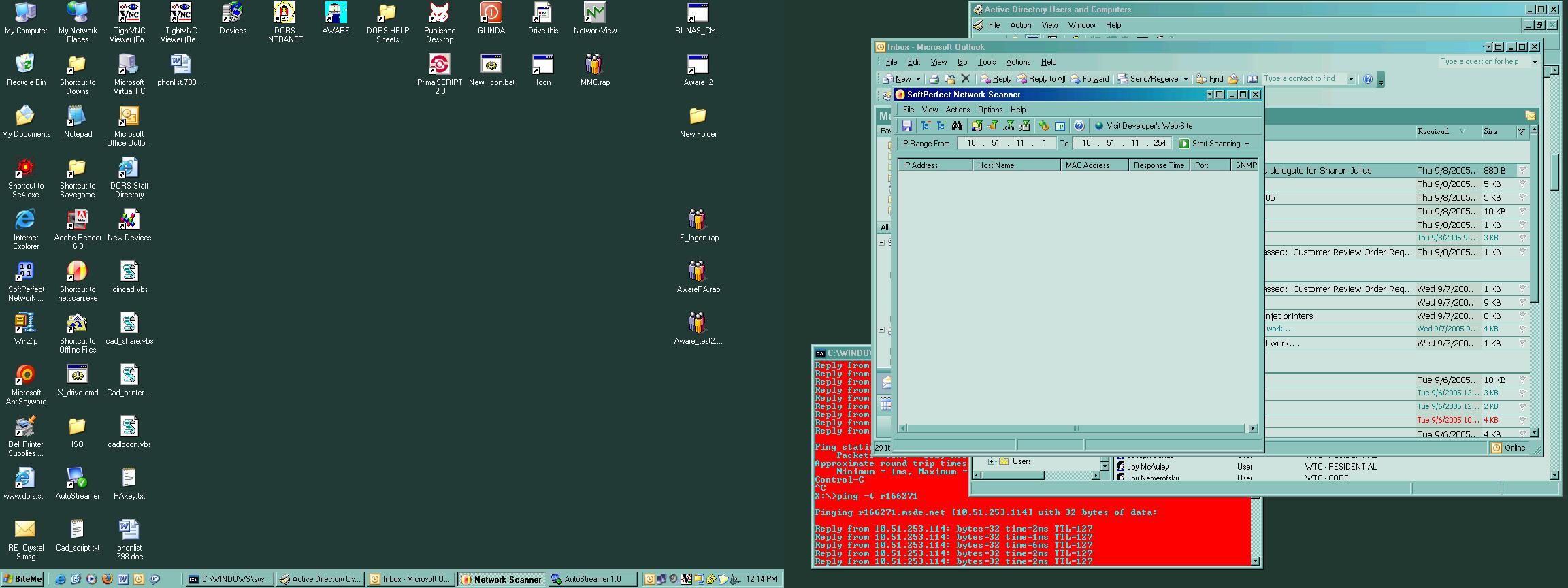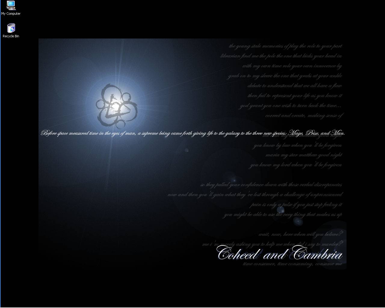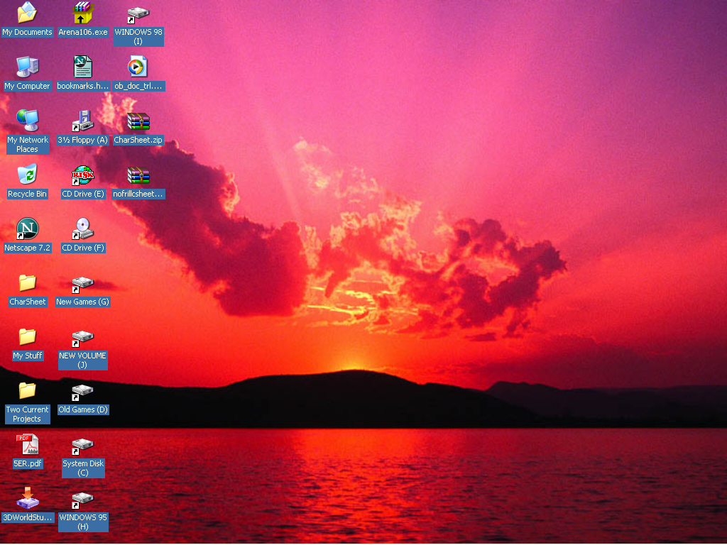 The grey at the bottom is the taskbar, hidden. The blue at the left is Trillian, hidden. I had originally had some different icons and such, but I reinstalled Win2k at the end of summer when I got a new SATA hard drive (it was originally on a PATA drive).