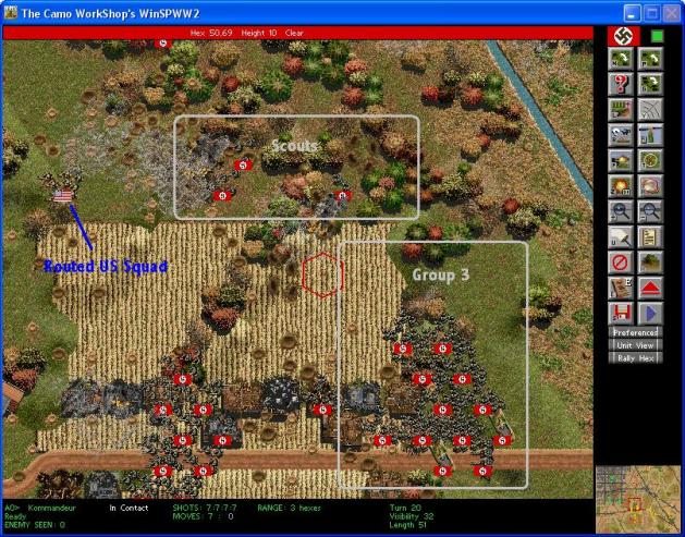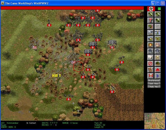 Engineers from Group 3 have established an East-West line in the middle of the woods. Grenadiers are swinging West to engage the enemy bazooka team on the North edge of Hill 2.