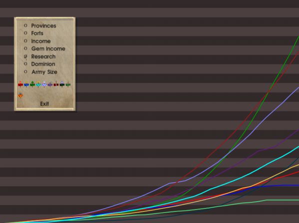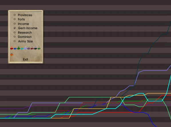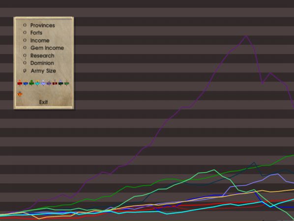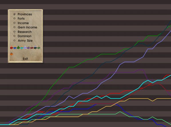 Always good to hear from a loyal reader The game is going pretty well, so long as you're not Mictlan or Atlantis right about now... For your viewing pleasure, I'm attaching some of the more relevant score graphs (provinces, gem income, research, and army size). I suspect that with all the wars breaking out now these rankings are going to fluctuate wildly, so stay tuned.