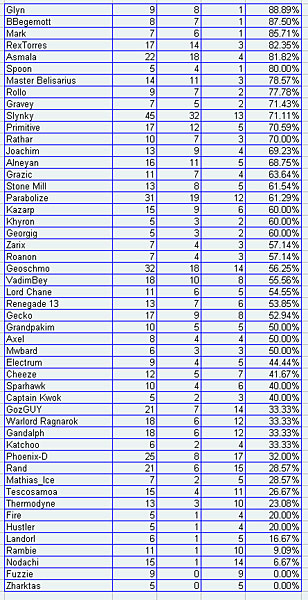 Just fiddling around. Since I don't like the listing of most wins at the top (despite how many games have been played...which can lead to having the most wins if one just keeps playing forever), I thought I'd do a better representation of the Hill. So the list wasn't swayed too much, I removed anyone who hadn't completed at least 5 games.