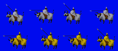 The reason there are 4 pics (8 including attack sprites) is simple. I made a gold one, changed the shield and couldn't decide if it looked better or not, then quickly made 'silver/iron/steel' versions as well. I have no idea which would be best for your purposes, although that much iron or steel barding kinda wouldn't make sense in the early era, so I'd guess the gold/bronze one is better.