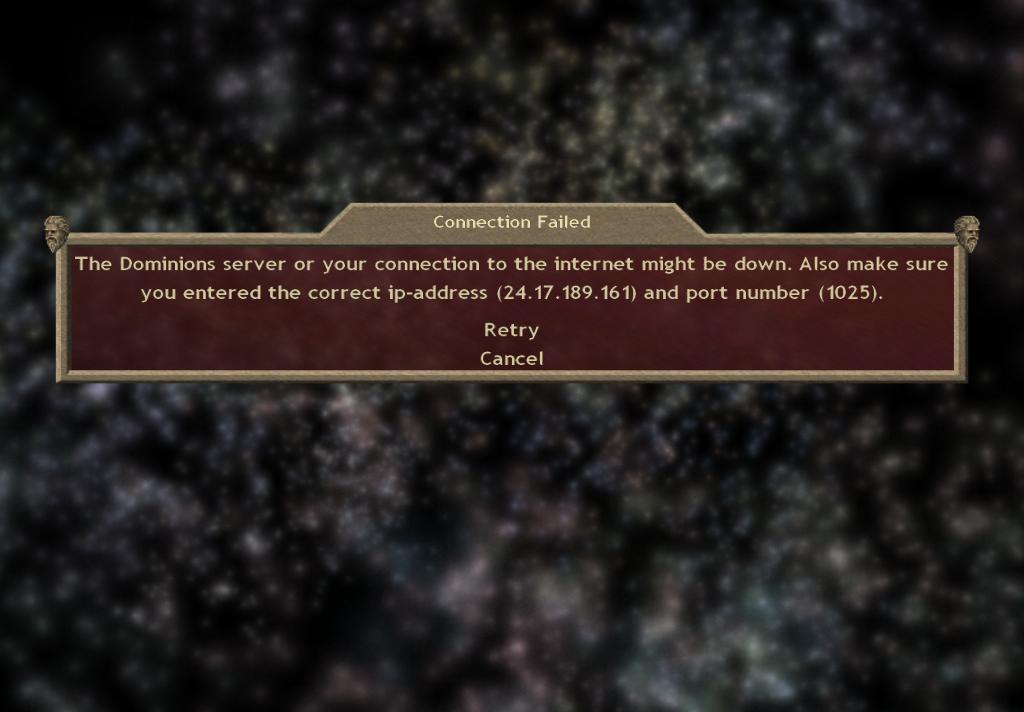 I have tried it without the --nonationsel, I have tried doing it manually by starting dom 3, choosing network game and putting in the IP and port. I have tried connecting with worthy heroes mod on, off. I have tested the map file in a single player game to make sure it loaded correctly. I have checked my router to make sure some weird bug had not reset my ability to connect to online games. This is absolutely baffling.
