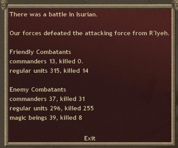 Oh, and the research boost seems to have allowed him access to some nasty Fire spells fairly quickly. I just hope R'lyeh can research up some counters before it's too late. And with all the troops and mages floating around, I think SCs and thugs will be somewhat marginalized (not enough gems to summon and equip enough to kill all those units fast enough). Again, something Squirrelloid and I noticed with Ashdod in NvV3, and that was only at 150% settings.