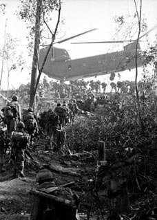 Soldiers of the 1st Air Cavalry Division board a Chinook helicopter that will take them from the valley, where they have been operating for a month against North Vietnamese troops defending the Ho Chi Minh Trail. A Shau Valley, 1968