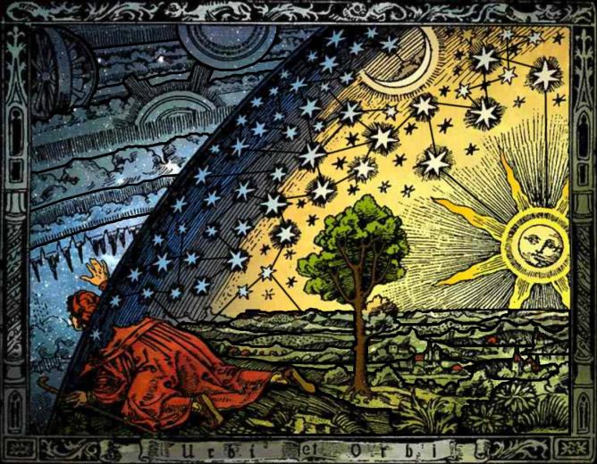 The first "Universe of the Spheres" is a colored woodcut, territories are outlined in bold, paths between stars and sphere's are marked with black lines. 81 land + 0 sea