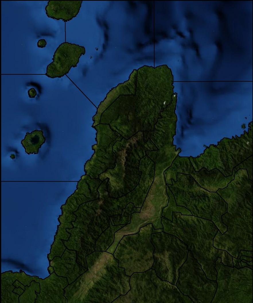 The second "Otherland", a satellite photo with territories outlined in bold. Any boarders that touch allow travel. 37 land + 6 sea