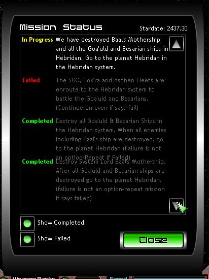 (7) When you press "V" your mission status box will appear...check both the "show completed" and "show failed" so all you see is only the missions in progress. If a mission says "Failure is not an option" then you must complete that mission to move on. If a mission says "Continue on even if says fail" then this mission was just used to load ships and don't worry if it says failed.