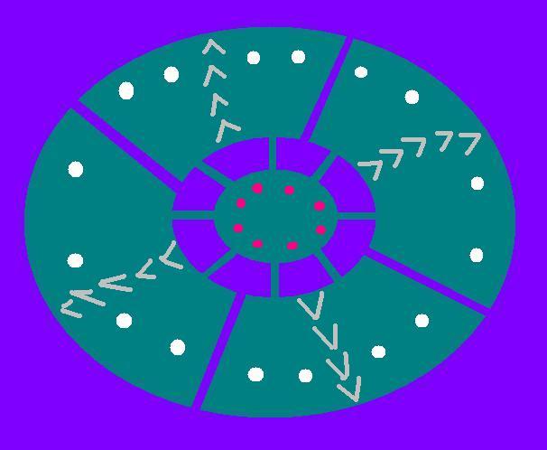 Unlike Rorschach, the central landmass will be divided into a smallish circular land core surrounded by a circular ring of water that is not contiguous but rather has land gaps (perhaps 2 provinces wide) at the cardinal (N,S,E,W) and intermediate (NE, SE, SW, NW) points. In other words, broken into 8 narrow segements of water. A larger, also circular land mass will lay between the inner core and the outermost ocean.