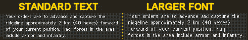 Here is an example of the standard and larger font as they appear in the game. The larger font works out to 25-30% larger when specific words are compared